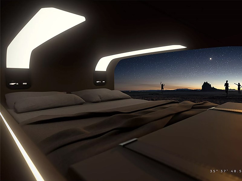 На фотографиях можно заметить только заднюю часть кузова с широкой светодиодной полосой и крупными колесами. Примечательно, что автомобиль лишен задних стекол и, вероятно, в этом месте будет находиться спальное пространство, доступ к которому будет открывать специальная лестница, интегрированная в бампер. В анонсе сказано, что салон можно трансформировать под разные сценарии использования, что делает концепт максимально универсальным.