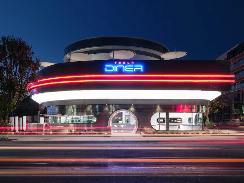 В Голливуде начал работу первый в истории развлекательный центр Tesla с рестораном, автокинотеатром и фирменной зарядной станцией для электрокаров