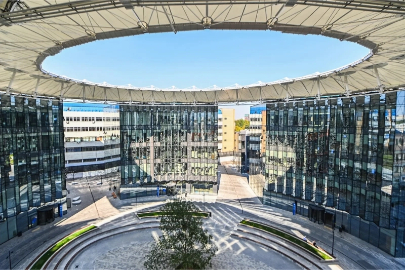 Треугольный корпус — как «крыло», которое держит сетка из алюминиевых профилей. Лёгкие фасадные системы позволяют дать максимум стекла и света без тяжёлых рам. Анодированные панели — ровная «кожа» без лишних швов. Для инженерного вуза — символичный хай-тек.