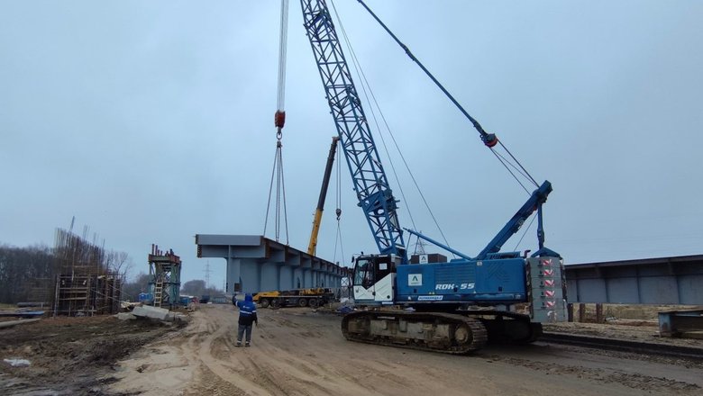 В рамках второй очереди первого этапа строительства подрядчик установил первый укрупненный блок металлических конструкций пролетного путепровода на временные опоры. Они обеспечивают поддержку пролетного строения, позволяют опустить его на опорные части и соединить конструкции с опорами путепровода.